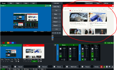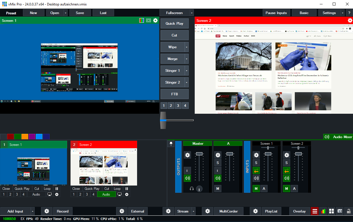 vMix hat 2 Quellen, Screen 1 und Screen 2.