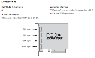 Eine PCIe-Karte, mit 4 HDMI Eingänge, HDMI-Quellen in jeder Kombination von SD, HD, Ultra HD, 4K und Computerformaten. Die Karte kostet ca. 600 CHF