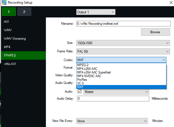 Danach lässt sich im FFMPEG Menu des Recorders MXF anwählen, es steht nur der XDCAM HD 422 codec zur Wahl.