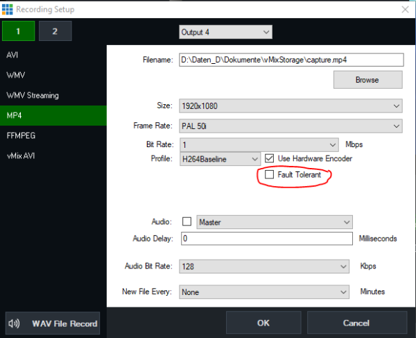 Die folgende Tabelle beschreibt die Fehlertoleranz für jedes von vMix unterstützte Aufzeichnungsformat.