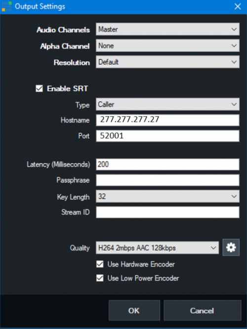 - Du kannst auch eine Passphrase einstellen um deine SRT-Verbindung zu verschlüsseln. Die Passphrase muss auf beiden Seiten gleich eingestellt werden.